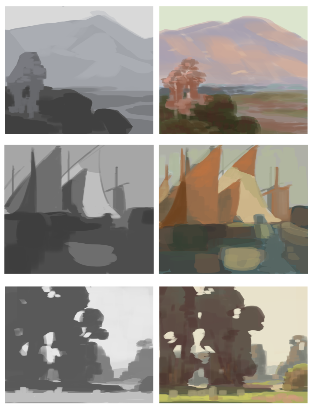 このあたりは日本のアニメ・ゲーム背景を描かれている方のいいメイキングがありそうなのでまた別の機会に探してみようと思います。
