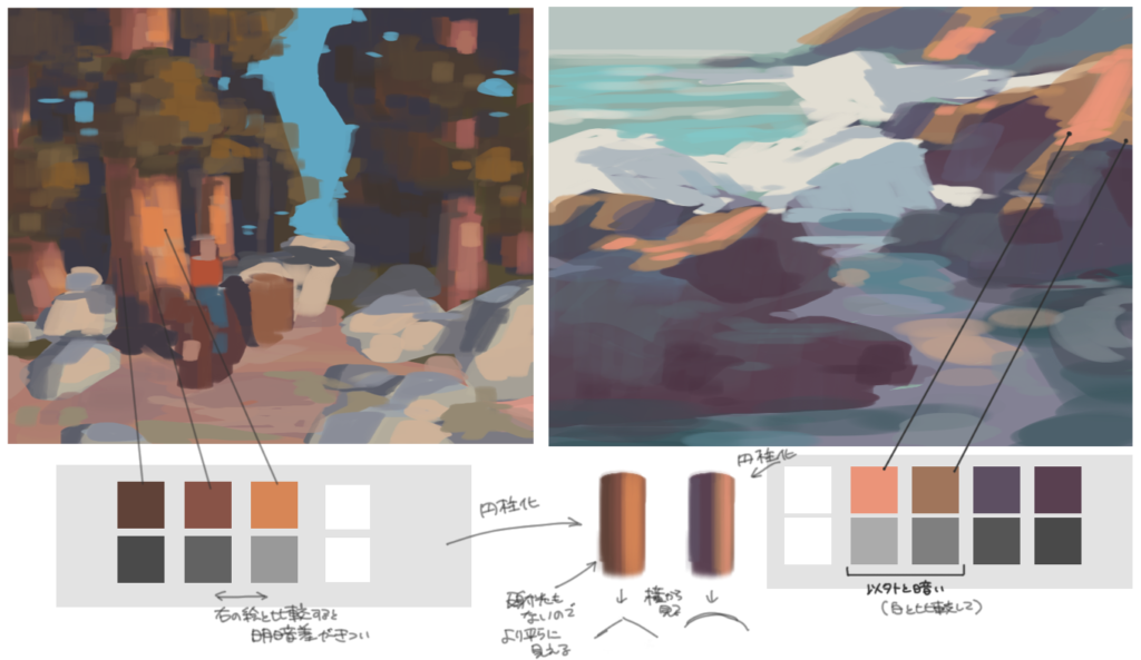 下の画像は模写をしていて気が付いた事のメモです。夕暮れ時の絵を描くときの色選びが苦手だったのですが、自分が想像しているよりも明度が暗かったり、明るい面~暗い面にかけて絶妙に色相が移り変わっている事が発見でした。