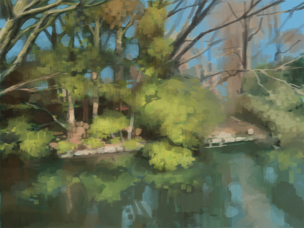 全体的な印象をざっくりとしたベースで描いてみたものの、これをどう完成度を上げていくかすごく悩んでいました。いろいろと試行錯誤した結果、下の画像の様にベースの粗い境目を葉ブラシでなじませていくという方法がうまくいきそうとの結論に落ち着きました。