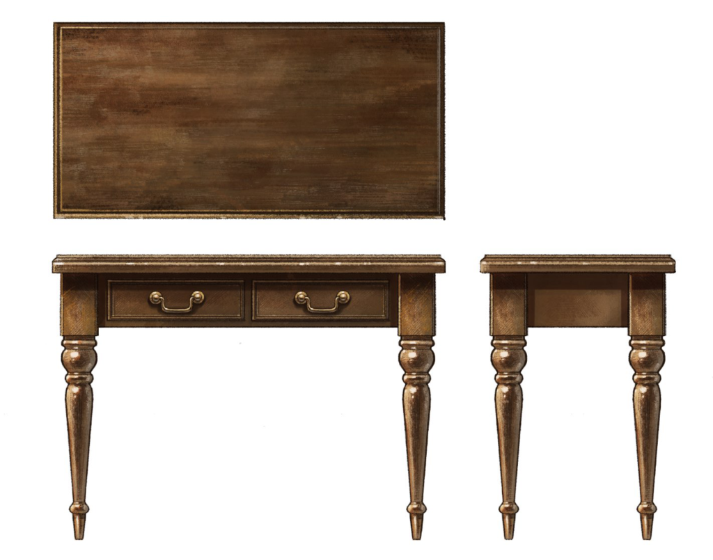 画像は描き進めていたアンティーク机の三面図です。私の本業は3Dデザイナーですがいつかデザインからモデリングまですべて担当できるデザイナーになりたいので練習として描いてみました。
